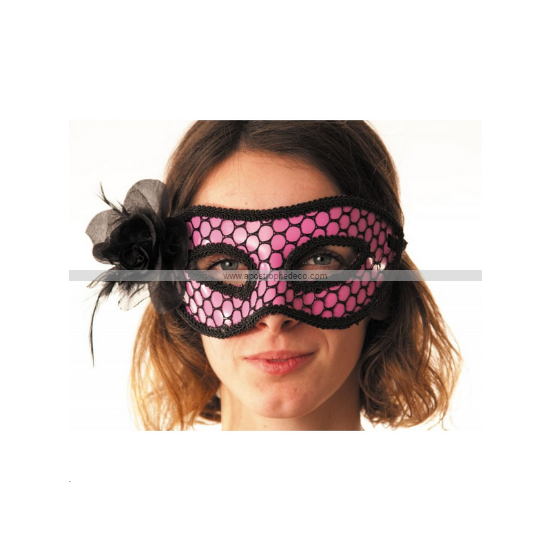 MASQUE/LOUP - Vénitien rose avec fleur noire (en plastique)