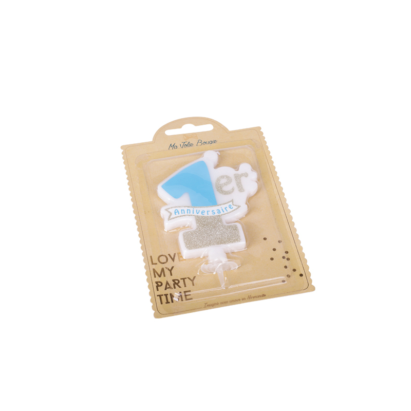 BOUGIE - Mon 1er anniversaire bleu pastel/or (8cm x 10cm)