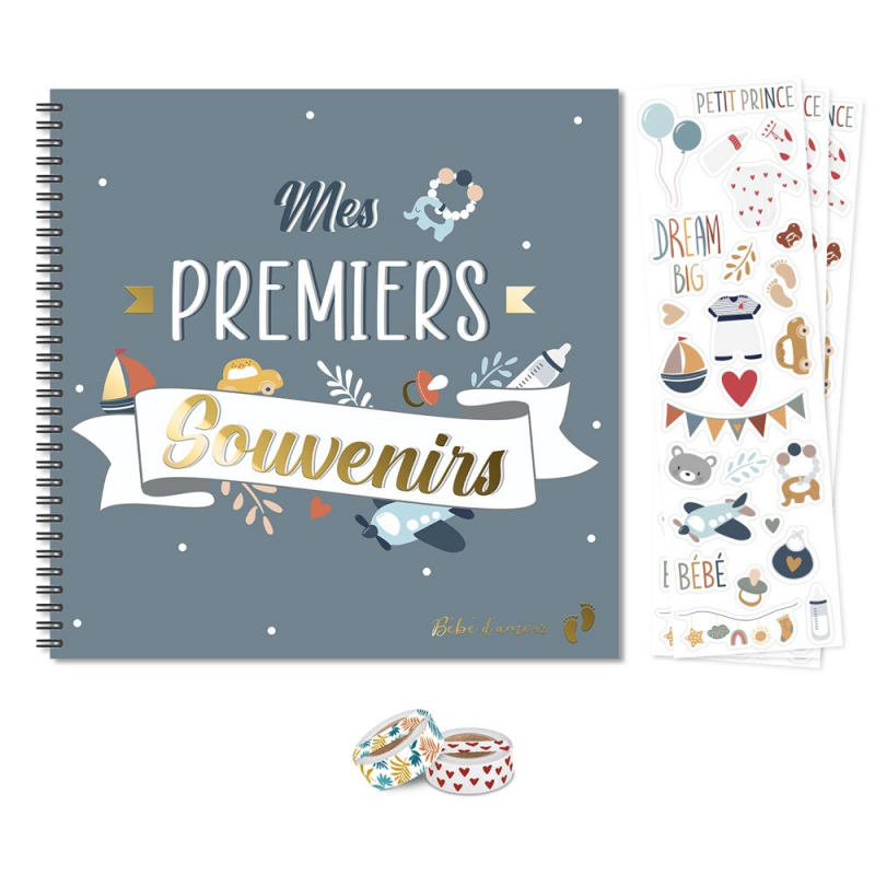 L album photo de bébé est un incontournable des cadeaux de naissance. Ce coffret album photo de 40 pages est la solution parfaite pour immortaliser les premiers souvenirs de bébé de manière originale et avec style ! L album photo de bébé est un incontournable des cadeaux de naissance ! Ses motifs de jouets pour garçon sur fond bleu marin comprenant la mention "Mes premiers souvenirs" en fait un objet de décoration que vous pourrez laisser dans la chambre de votre garçon ! Il contient 3 planches de stickers originaux ainsi que 2 rubans à motifs pour personnaliser votre album photo. En plus de vous rappeler des moments inoubliables
