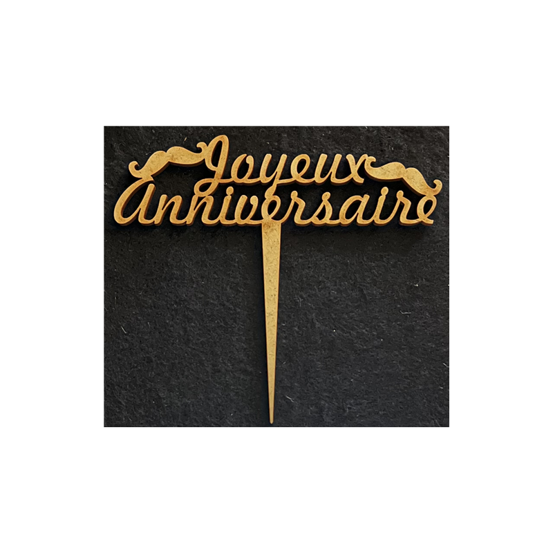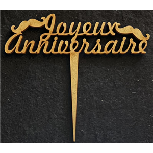 TOPPER - Joyeux anniversaire avec ses moustaches (en bois 12cm x 12cm)
