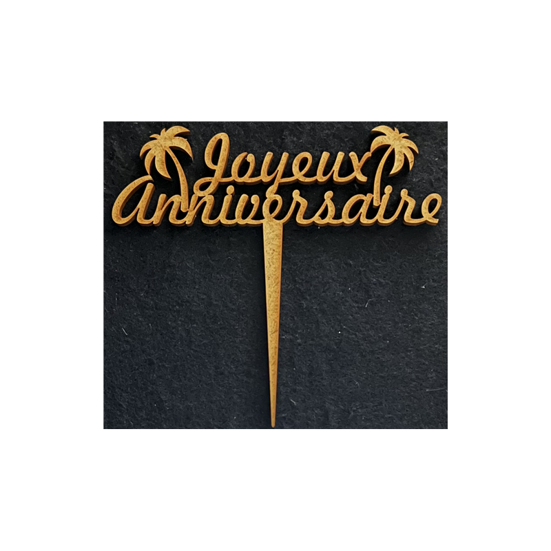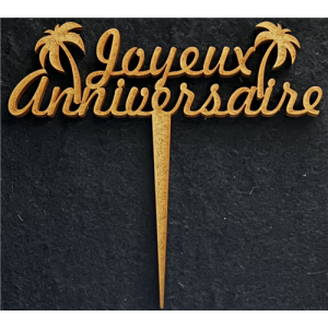 TOPPER - Joyeux anniversaire avec ses palmiers (en bois 12cm x 12cm)