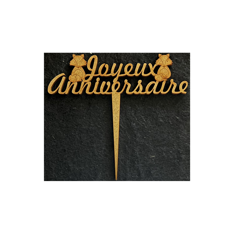 TOPPER - Joyeux anniversaire avec ses renards (en bois 12cm x 12cm)