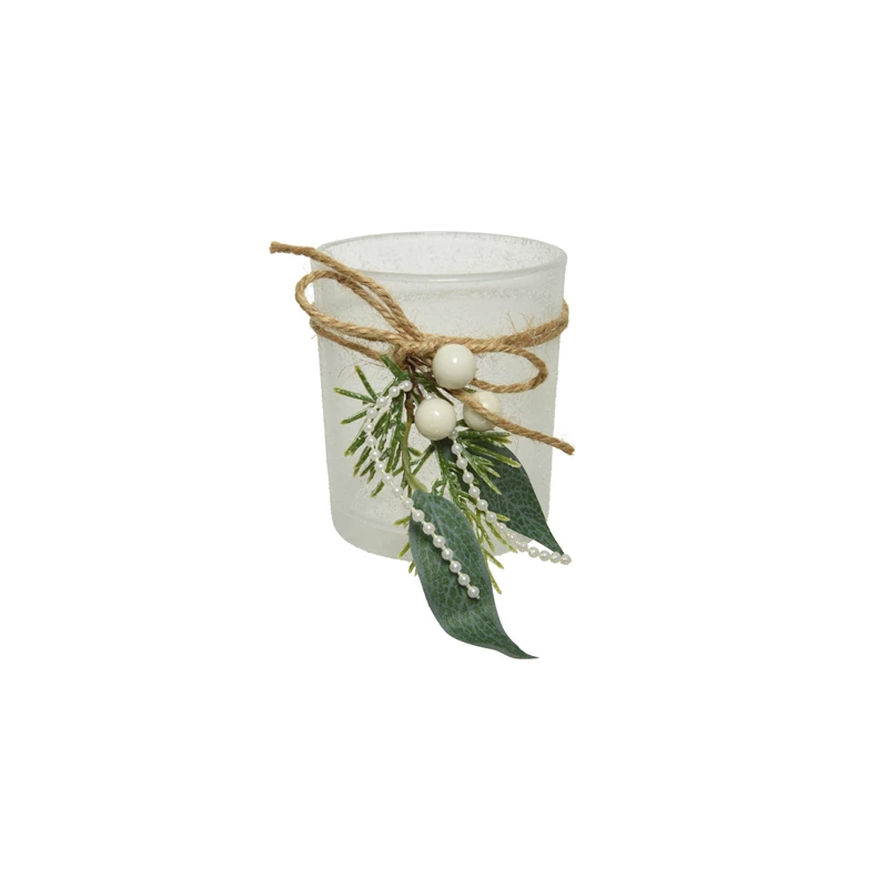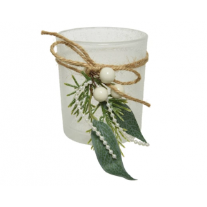 BOUGEOIR/PHOTOPHORE - Neige avec décor baie blanche et gui (en verre 8.2cm)
