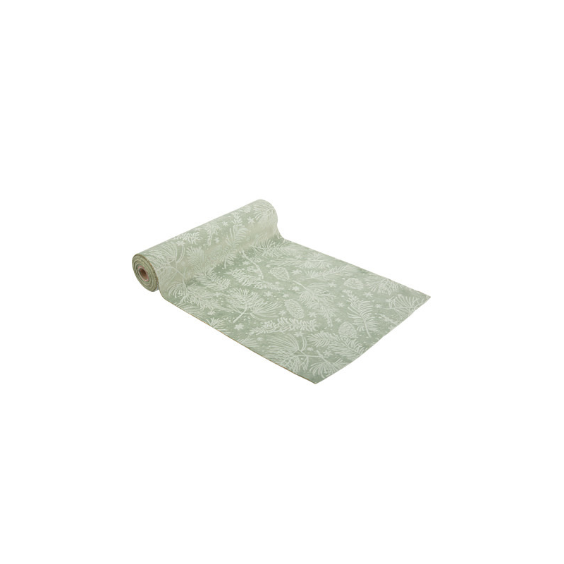CHEMIN DE TABLE - Vert sauge avec impression branchage blanc (en velour 28cm x 3