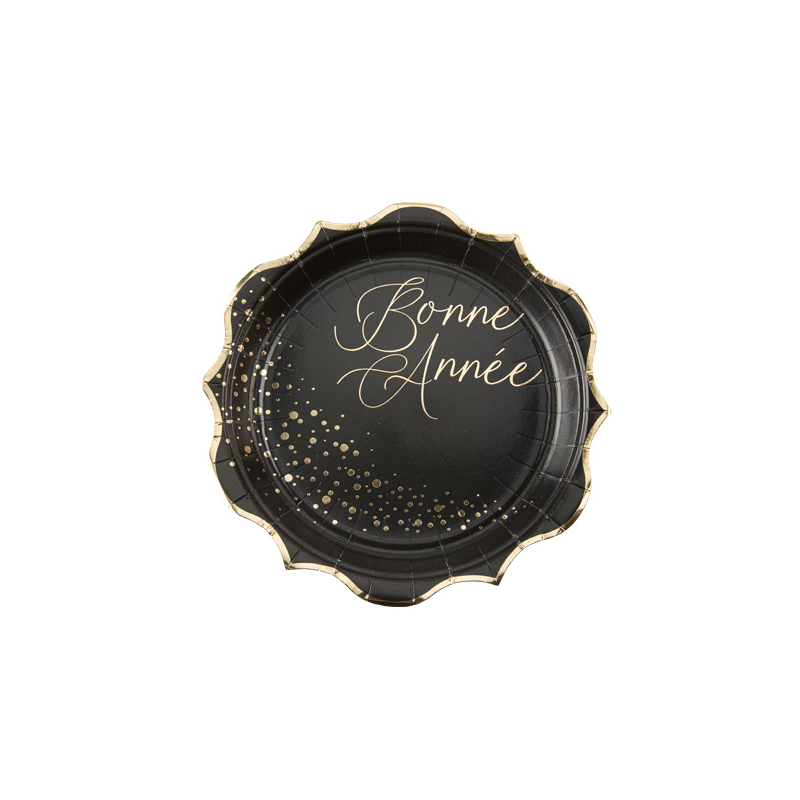 Une table de fête sans vaisselle à laver ! Ce lot de 8 assiettes en carton "Bonne Année" sélectionnées par Apostrophe déco allie praticité et glamour. Sur un fond noir mat, l'inscription en calligraphie dorée et la bordure festonnée créent un effet luxueux et festif.