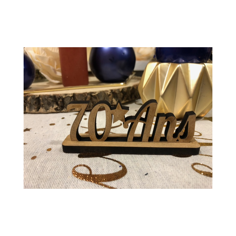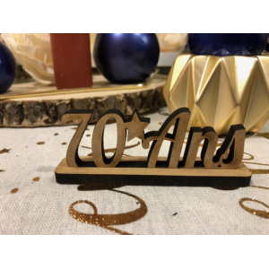 CENTRE DE TABLE - 70 ans x 3 (en bois sur support 9.5cm x 3cm)