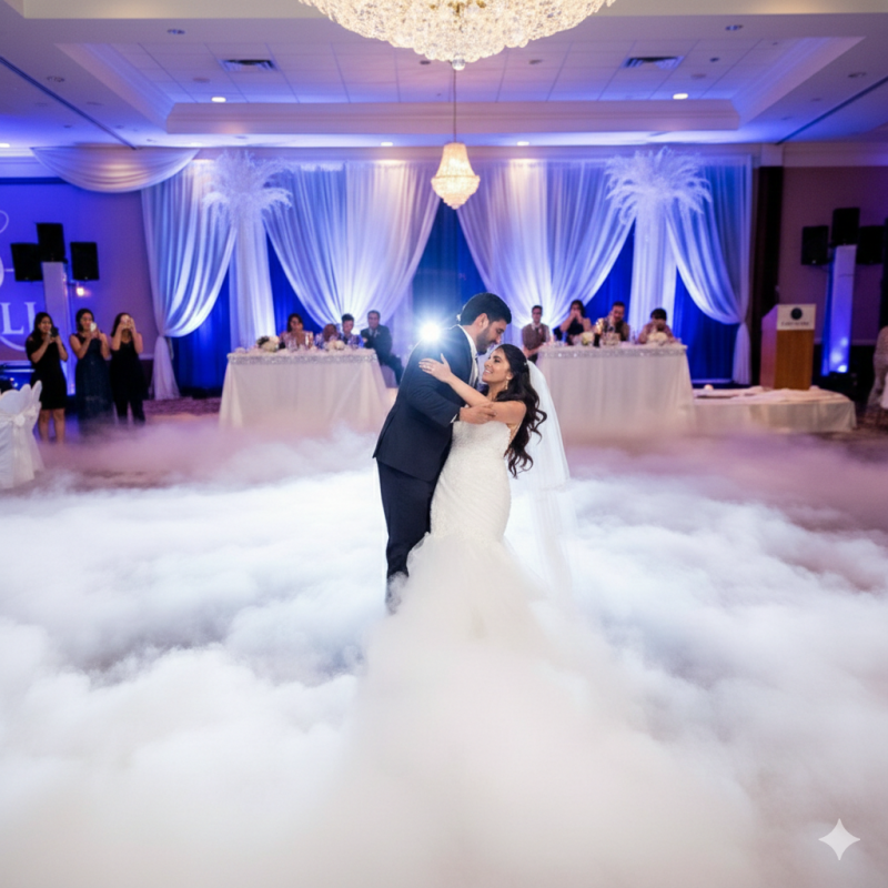 Deux puissants éléments à ultrasons convertissent le mélange de liquide de fumée et d’eau distillée en une grande quantité de magnifique brouillard au ras du sol pour 120m2.
