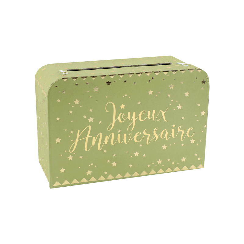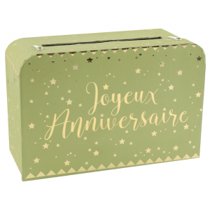 URNE/TIRELIRE - Joyeux anniversaire vert sauge/or (en carton 16cm x 24cm)