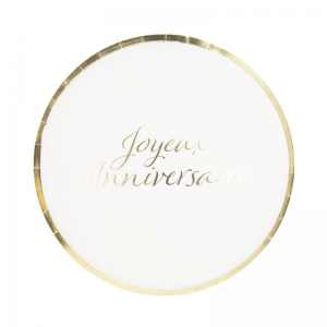 ASSIETTE - Joyeux anniversaire blanc et or/doré x 8 (en carton 23cm)