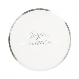 ASSIETTE - Joyeux anniversaire blanc et argent x 8 (en carton 23cm)