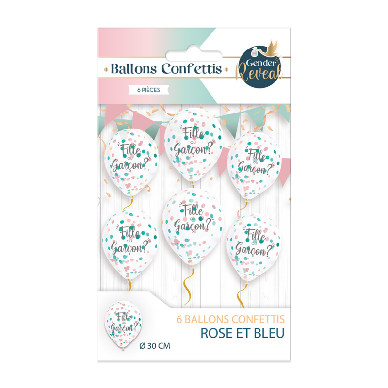 BALLON - Baby shower/gender reveal/Fille ou garçon avec confettis rose et bleu x 6 (en latex 28cm)
