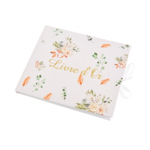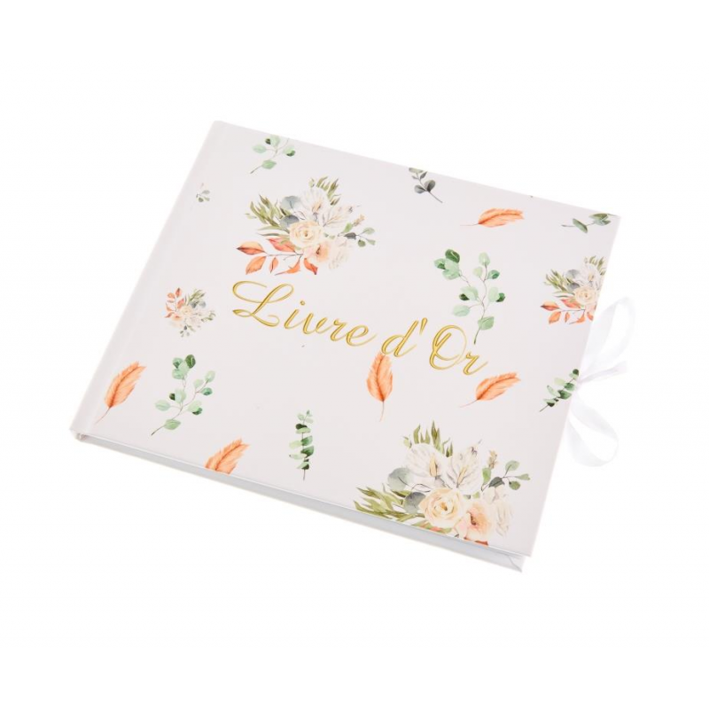 LIVRE D'OR - Blanc avec fleurs, feuillage et plume orange (22cm x 19cm 64 pages)
