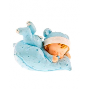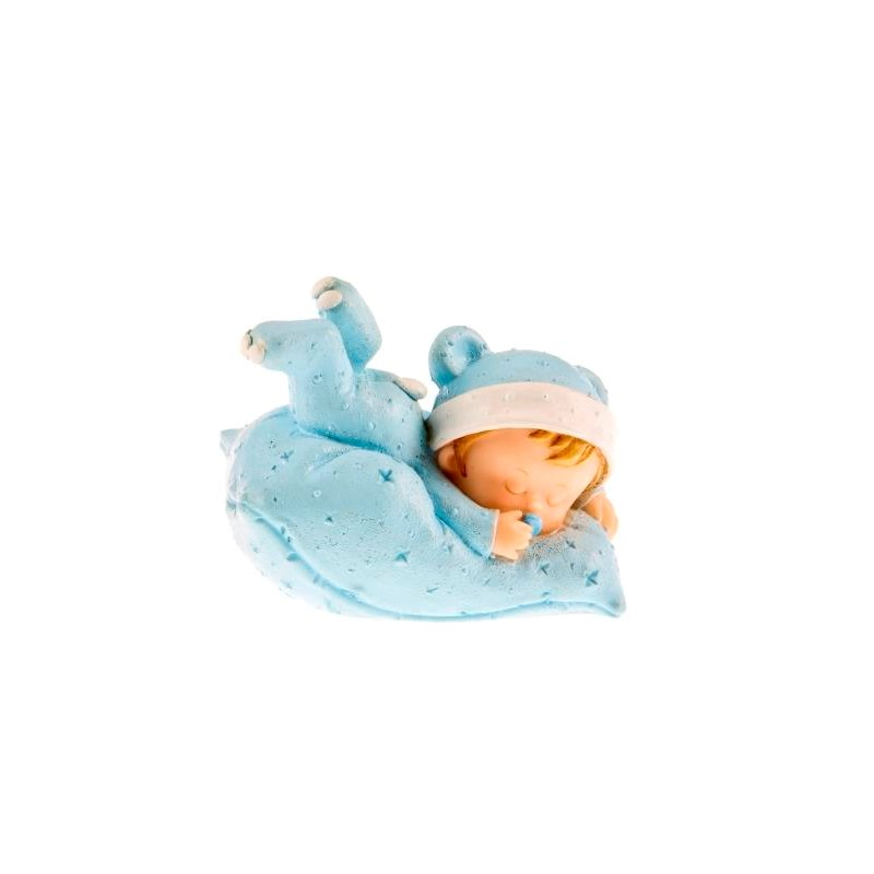 SUJET GATEAU/DECOR DE TABLE - Bébé garçon/bleu sur son coussin (en résine 7cm)