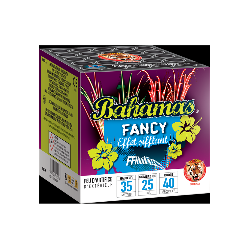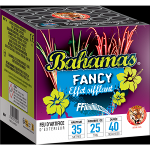 La gamme BAHAMAS® de la collection Le Tigre® vous promet un joli voyage visuel et sonore pour chacun des 4 feux d’artifice compacts qui la compose ! Voici notre BAHAMAS FANCY, de calibre 20mm et ses drôles de comètes traçantes aux effets sifflants et tourbillonnants. De quoi vous tournez la tête et illuminer joyeusement vos soirées de fête ! Découvrez également dans cette gamme "BAHAMAS BLINK", "BAHAMAS GLITTER" et "BAHAMAS CRACKLING".