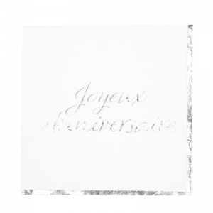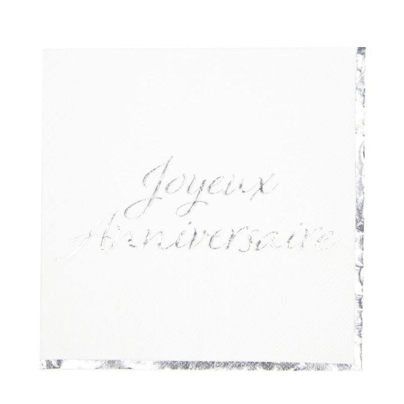 SERVIETTE - Joyeux anniversaire blanc et argent x 16 (33cm x 33cm)