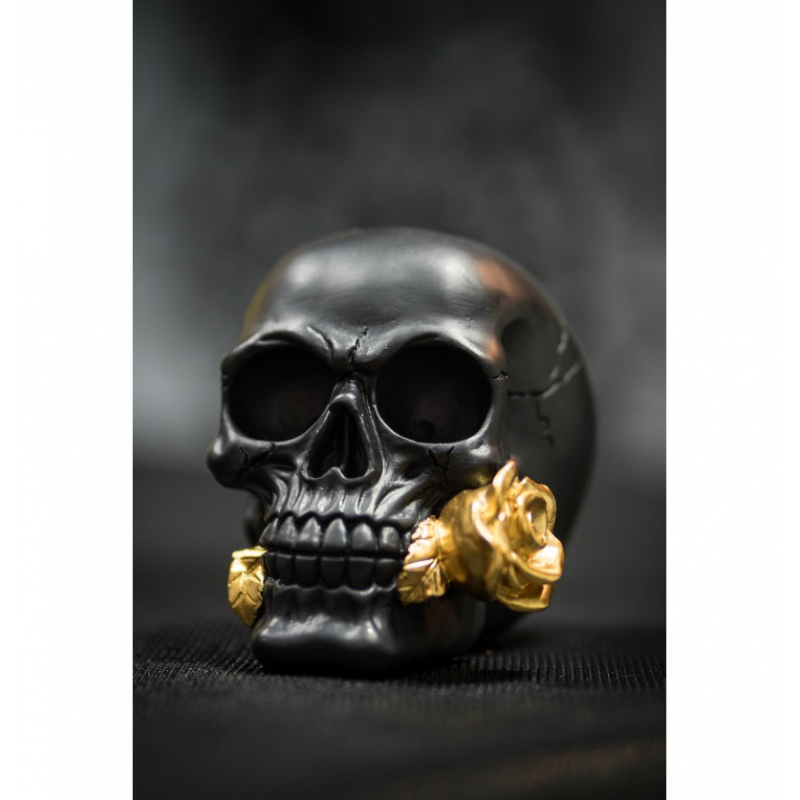 DECOR HALLOWEEN - Tête de mort avec rose or/dorée (en résine 15cm)
