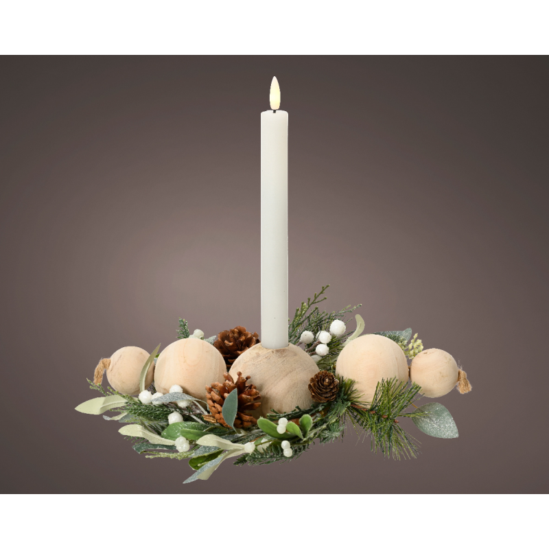 CENTRE DE TABLE - Bougie led, feuillage et boule en bois (30cm)