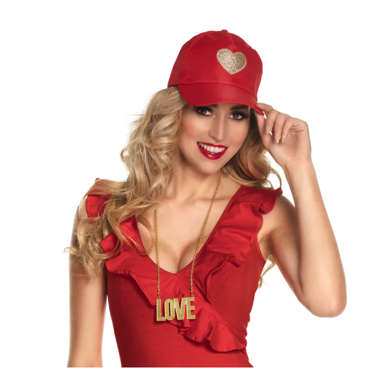 CHAPEAU - Casquette rouge avec coeur or/doré (ajustable en tissu)
