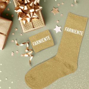 Le "Farniente", c'est ce doux moment où l'on profite de l'instant présent sans se presser. Cette paire de chaussettes à message est le cadeau idéal pour toutes celles qui savent que le repos est sacré. Offrez-les à une amie qui a besoin de souffler, ou pour célébrer des vacances bien méritées.