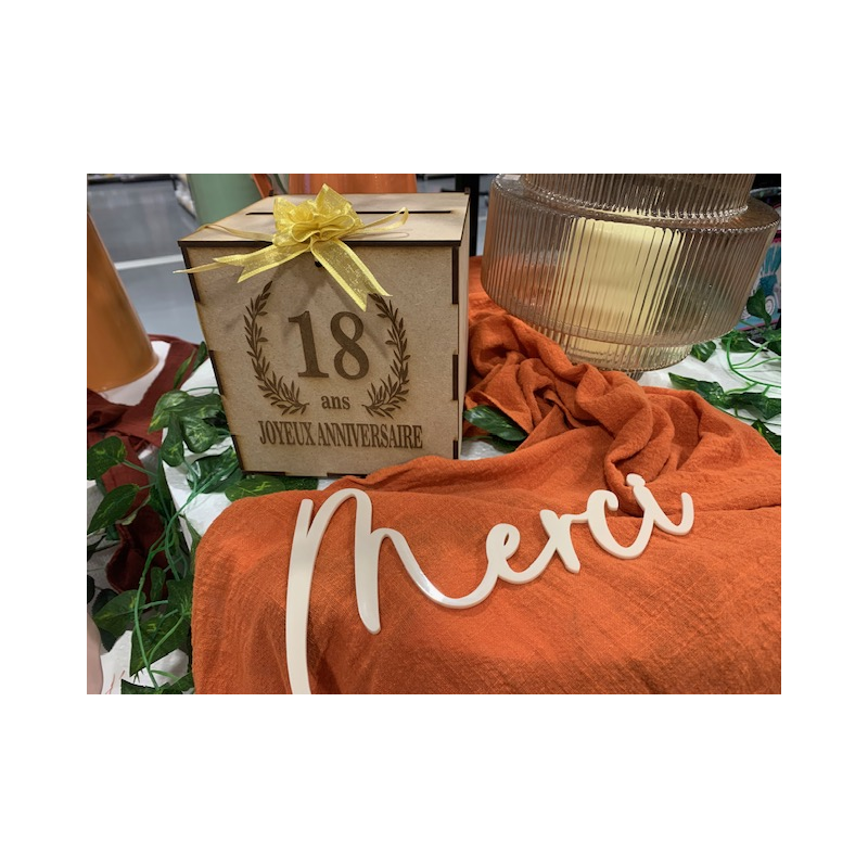URNE/TIRELIRE - 18 Ans avec sa couronne de laurier (en bois 15cm x 15cm) .