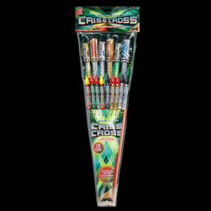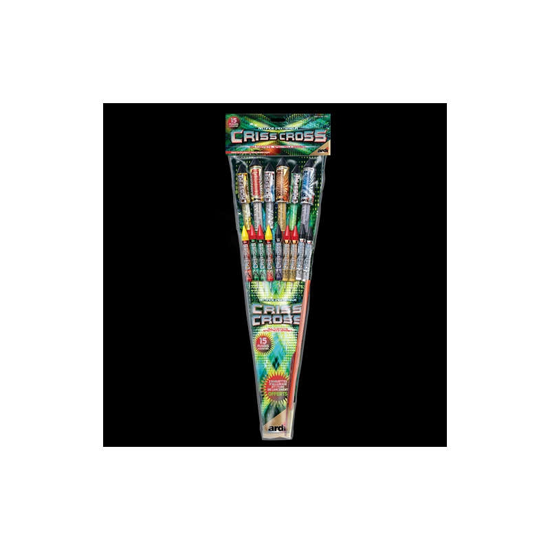 9 fusées CRISS CROSS® effets assortis : Poisson argent, étoile crépitante x2, étoile rouge et verte, clignotant blanc x2, étoile verte x2, étoile rouge.