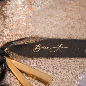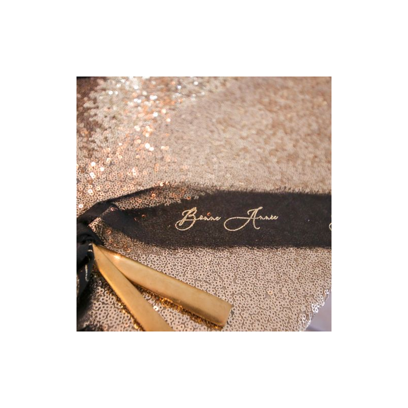 Ce ruban se marie à merveille avec des éléments dorés brillants, comme les sequins ou les paillettes (parfait sur une nappe à sequins dorés comme sur l'image) pour un Nouvel An glamour et inoubliable.