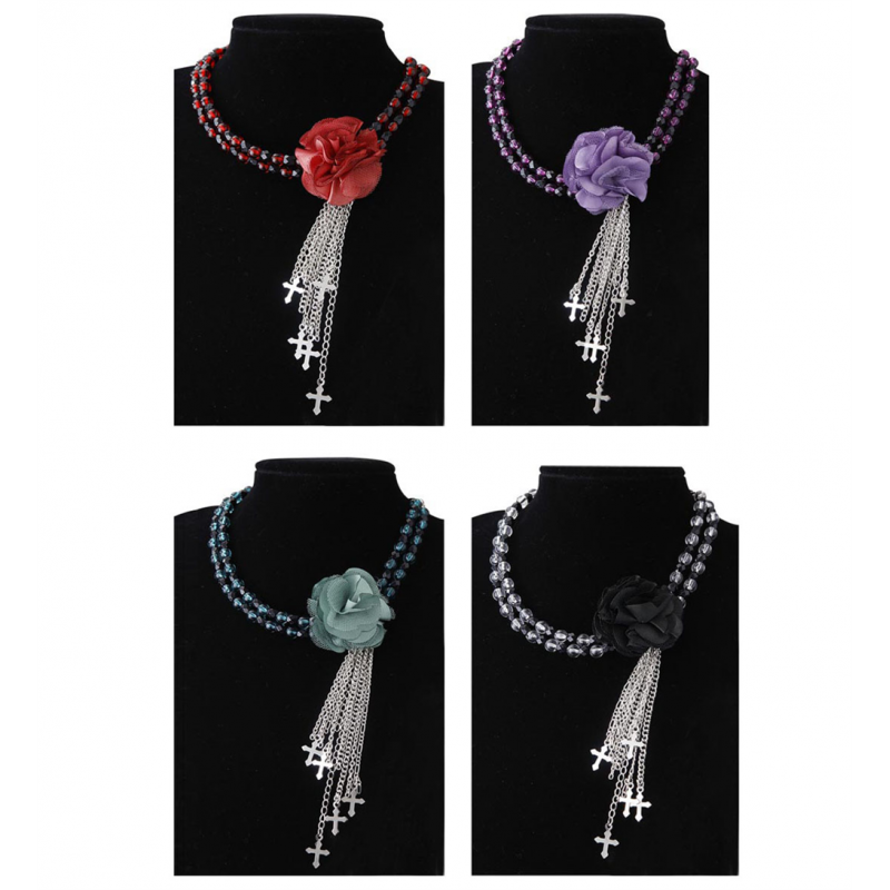 COLLIER/RAS DE COU - Avec rose et croix (coloris au choix)