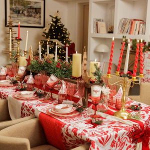 Retrouvez la magie des Noëls traditionnels avec cette superbe nappe "Folky Christmas". Son design folklorique, riche en motifs rouge et blanc d'inspiration scandinave, installe instantanément une ambiance festive et accueillante. Elle est la base parfaite pour une décoration qui mélange le bois, les bougies et les éléments naturels.