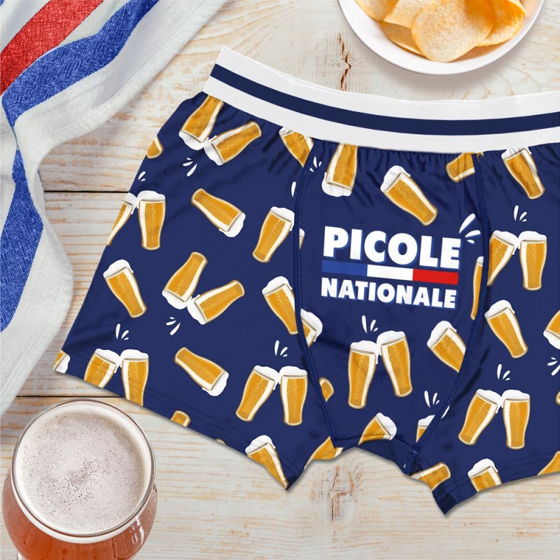 Il n'y a pas plus Français que ce caleçon "Picole Nationnale" ! C'est le cadeau parfait pour cet ami, ce frère ou ce chéri qui ne jure que par deux choses : la France et l'apéro (surtout l'apéro). Le design est un chef-d'œuvre : des pintes de bière mousseuses sur un fond bleu profond, et le slogan "Picole Nationnale" avec le drapeau français.