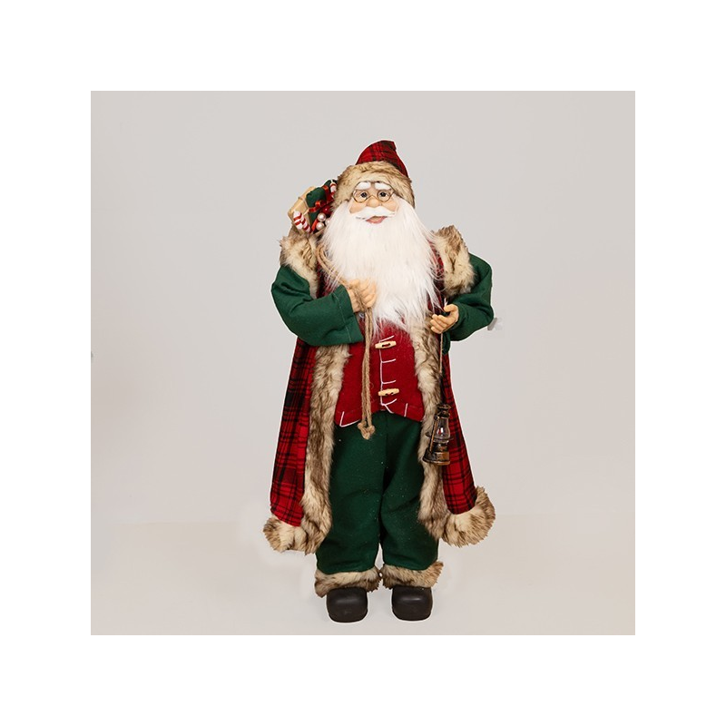 Apportez une ambiance "Noël Victorien" ou "Chalet de montagne" à votre événement. La location de ce Père Noël de 90cm change du look habituel. Avec son manteau vert, sa doublure en plaid écossais, ses bordures en fourrure, sa hotte remplie et sa lanterne à l'ancienne, il semble tout droit sorti d'un conte de Dickens.