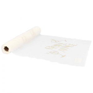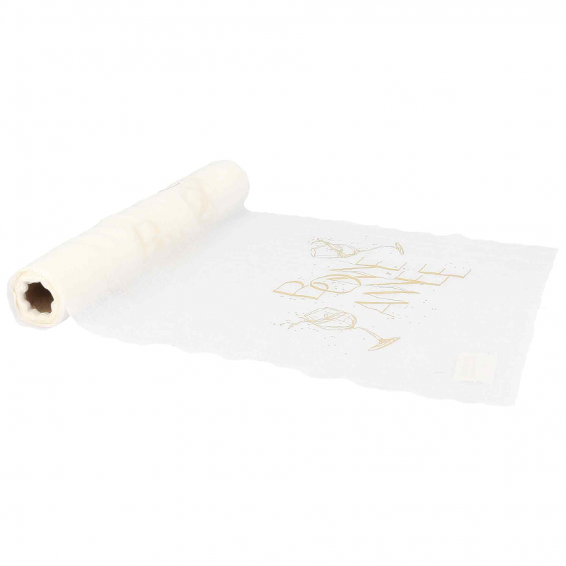 Ce chemin de table est parfait pour celles qui recherchent l'élégance sans l'opulence. Sa matière en mousseline (type intissé ou voile) est très facile à disposer et permet de mettre en valeur la nappe en dessous. Les motifs sont un mélange de l'inscription "Bonne Année" et de flûtes de champagne qui trinquent, le tout imprimé en doré scintillant.