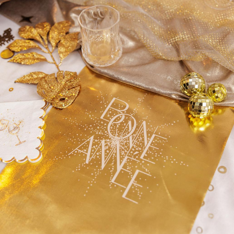Un réveillon sous le signe du glamour ! Ce chemin de table "Bonne Année" sélectionné par Apostrophe déco est réalisé dans une matière brillante effet métallisé or qui capte la lumière.