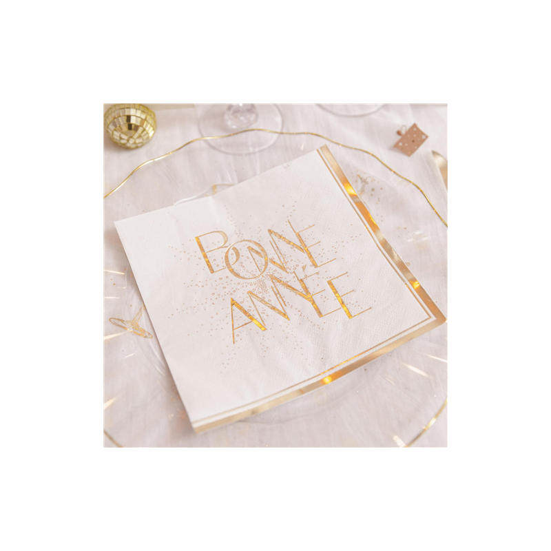 Une table de Nouvel An éclatante et moderne ! Ce lot de 16 serviettes en papier "Bonne Année" sélectionné par Apostrophe déco est idéal pour une ambiance sophistiquée. Le fond blanc pur met en valeur le message "BONNE ANNÉE" et le motif de confettis lumineux imprimés en doré Art Déco.