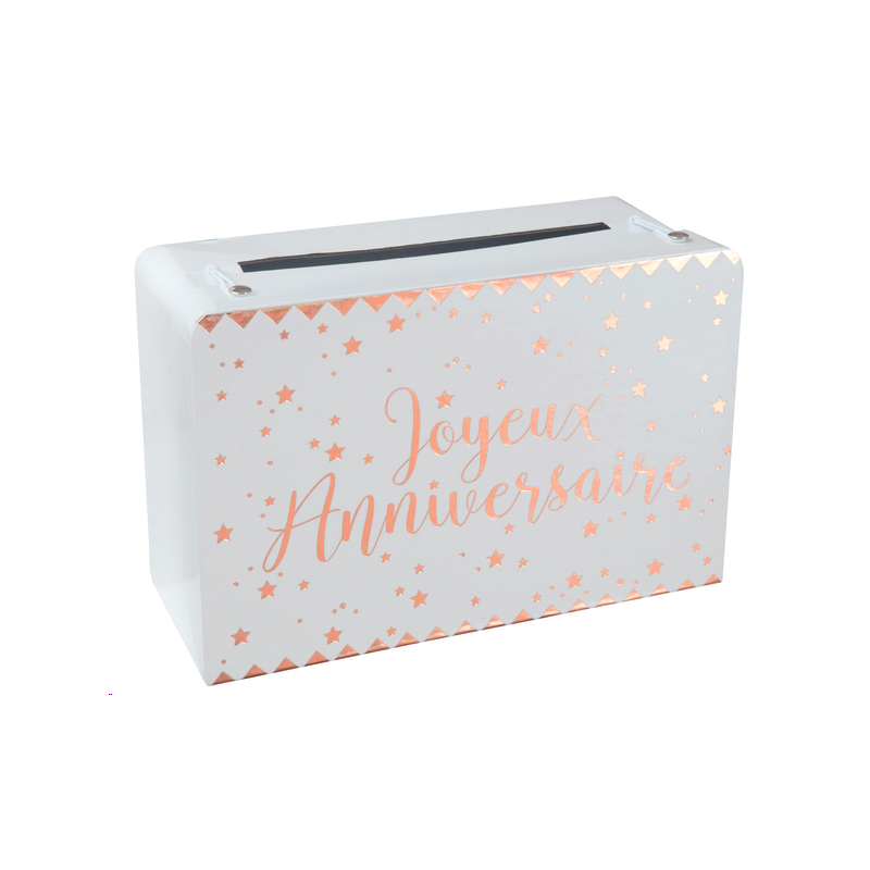 URNE/TIRELIRE - Joyeux anniversaire blanc/rose gold (en carton 16cm x 24cm)