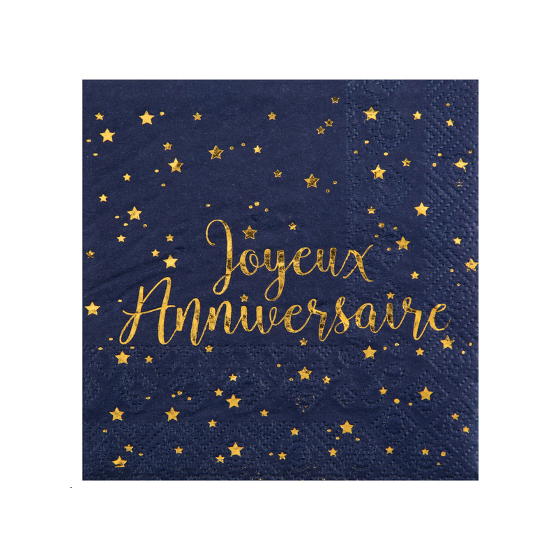 SERVIETTE - Joyeux anniversaire bleu marine avec inscription or/doré x 20 (20cm x 20cm)