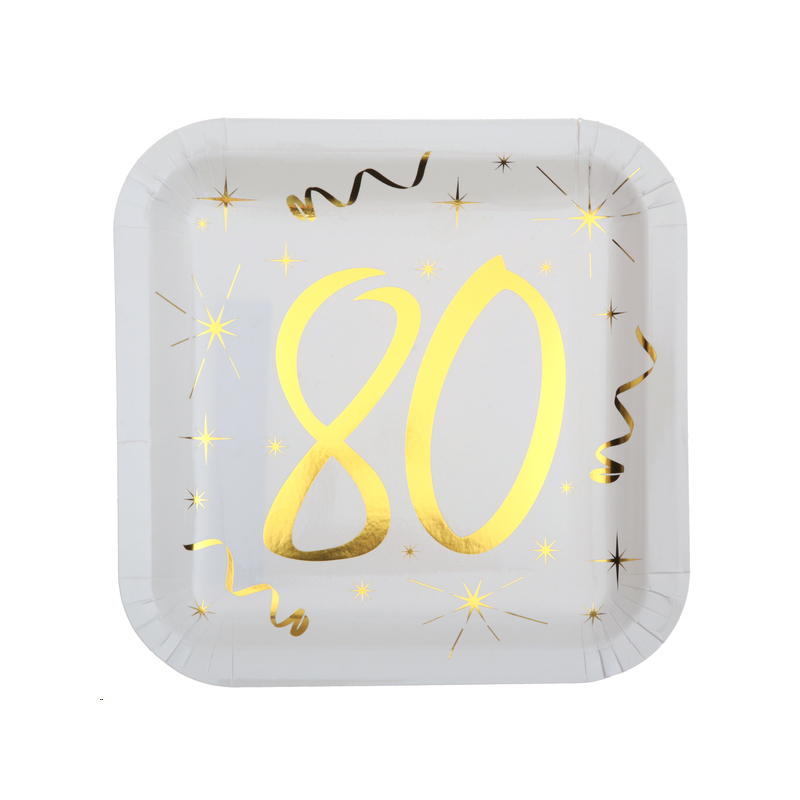 ASSIETTE - 80 ans blanche avec inscription or/dorée x 10 (en carton 23cm)