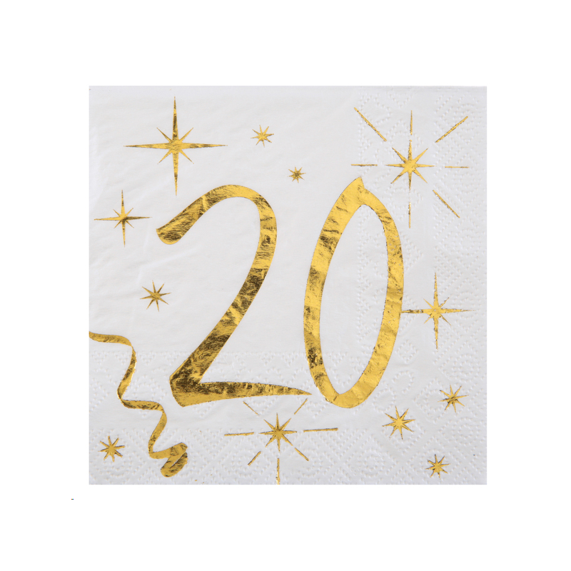 SERVIETTE - 20 ans blanche avec inscription or/dorée x 20 (20cm x 20cm)