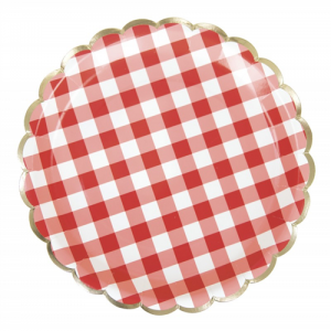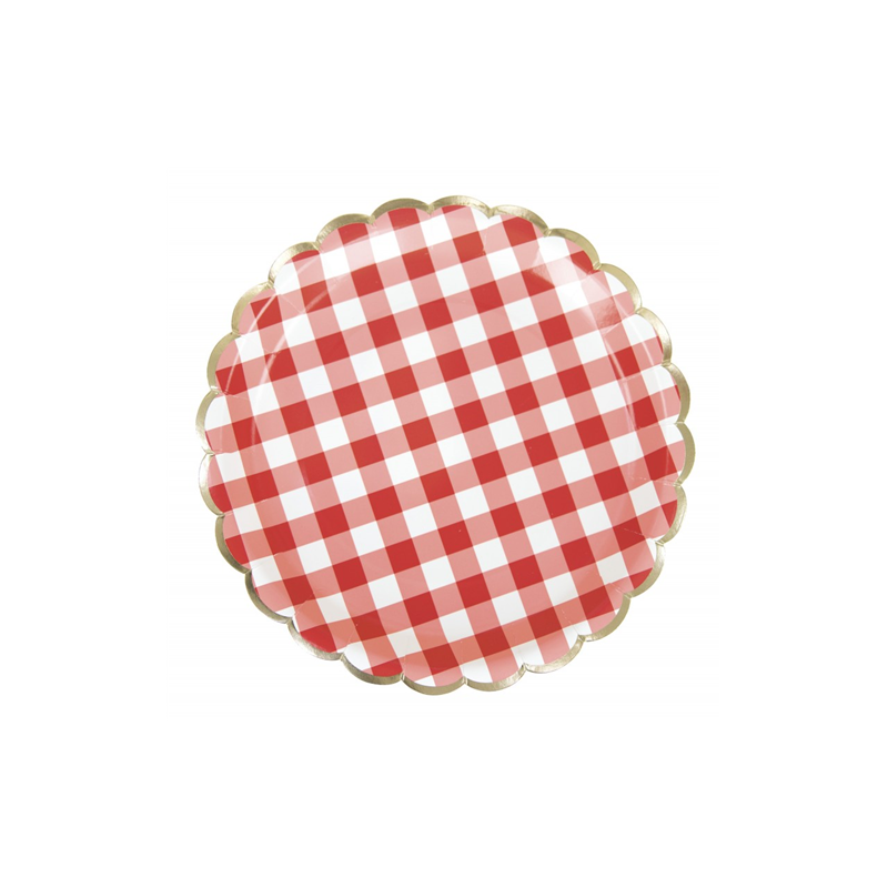 ASSIETTE - Festonnée guinguette/vichy/à carreaux rouge et blanc avec bord or/doré/gold x 8 (en carton 23cm)