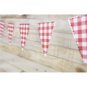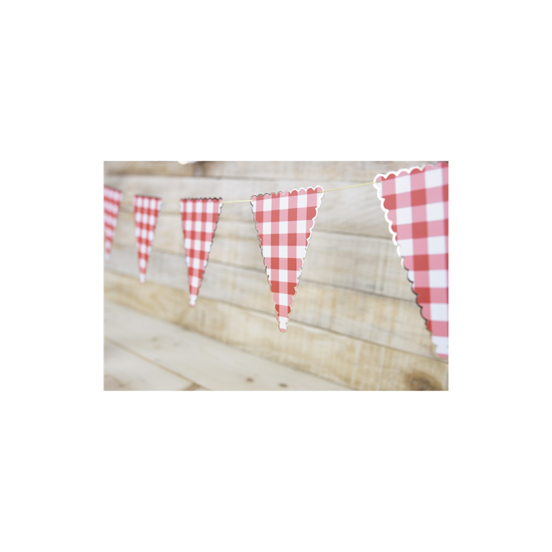 GUIRLANDE - Fanion guinguette/vichy/à carreaux rouge et blanc avec bord festonné or/doré/gold (en carton 3m)