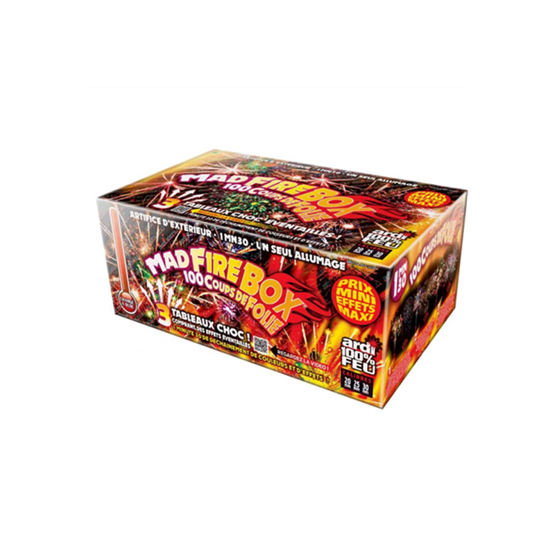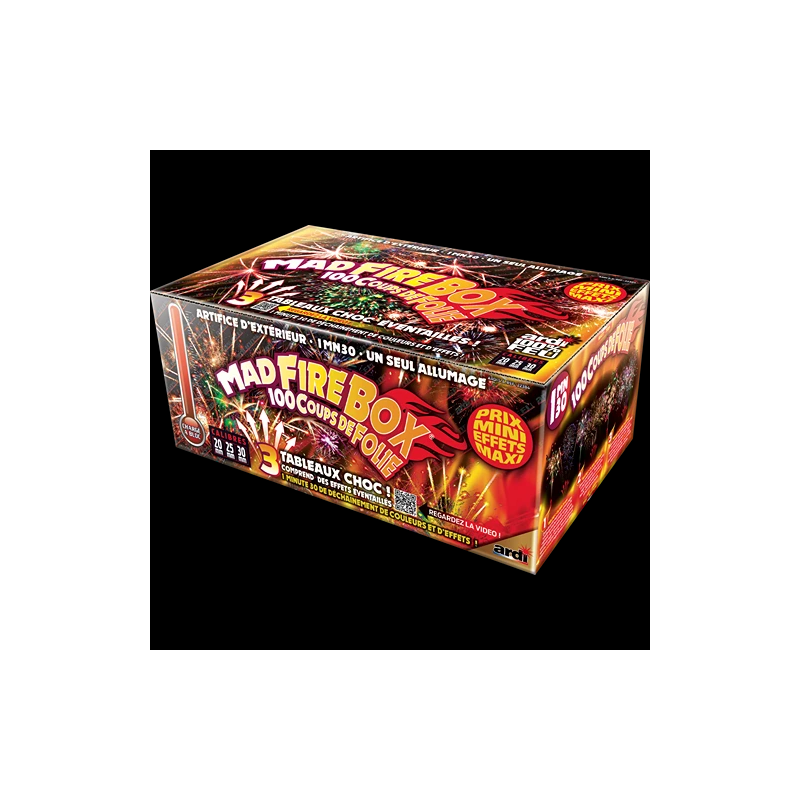 ARTIFICE - MAD FIRE BOX - F3 - Durée 1minutes30 - Hauteur 30 mètres - Distance de sécurité 25 mètres - Article ni repris, ni échangé.