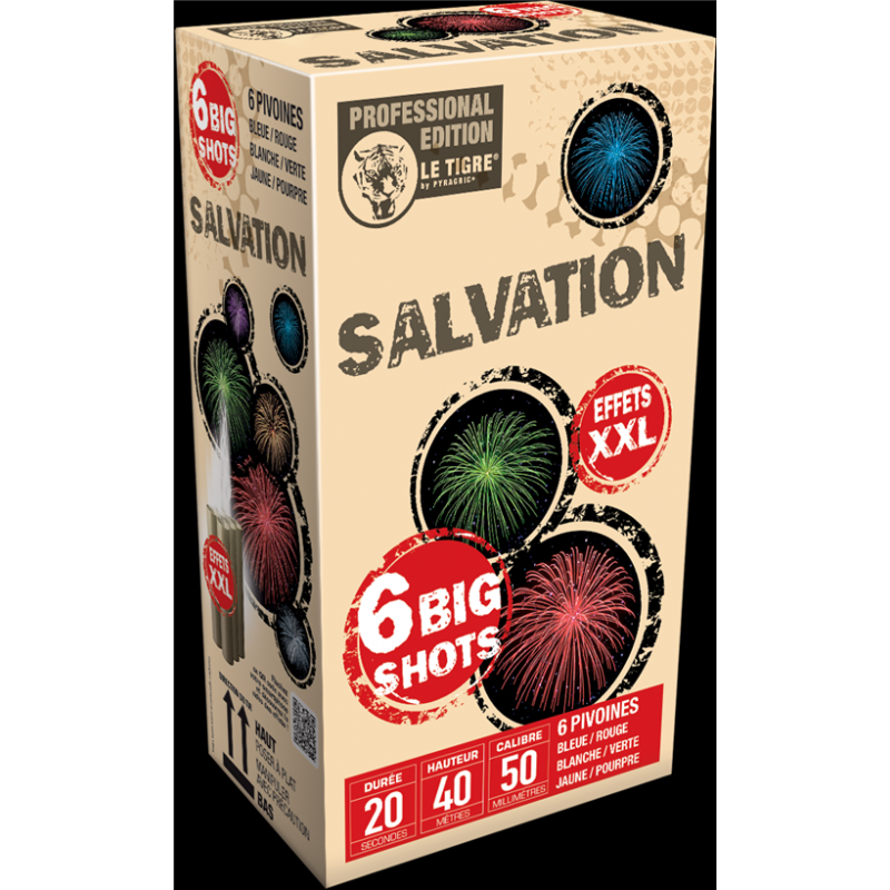 SALVATION est un feu d'artifice compact très puissant qui expulse l'une après l'autre 6 grosses pivoines de 6 couleurs différentes. Sa forme particulière, base étroite et grande hauteur, nécessite qu’il soit bien calé pour ne pas qu’il bascule pendant son fonctionnement. Les pivoines sont de couleur bleue, rouge, blanche, verte, jaune et pourpre et de grande amplitude. Idéal en bouquet final par exemple.