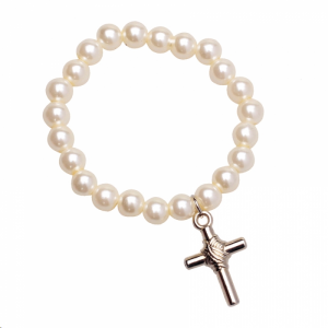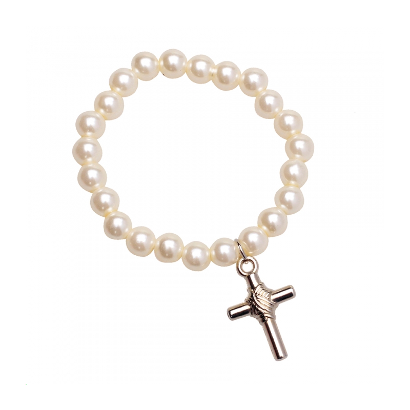 BRACELET - Perle avec croix argent (6cm) Joli cadeau souvenir pour Parrain et Marraine