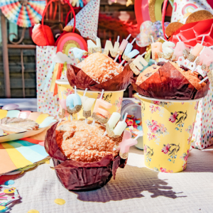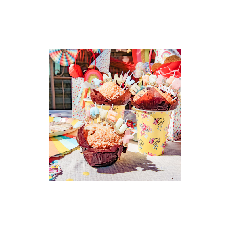 BOUGIE - Joyeux anniversaire multicolore pastel et or/doré (sur pic)
