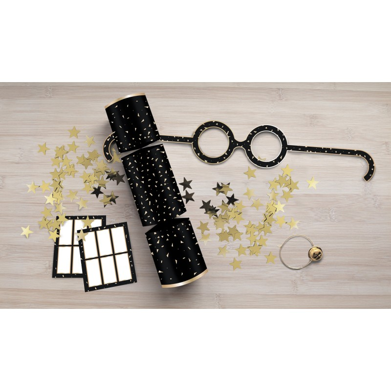 Chaque crackers contient une paire de lunette, un charms de verre, des jolies étiquettes et une pluie d'étoiles dorées