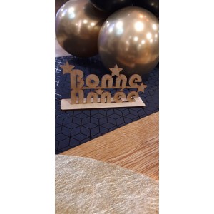 Oubliez le plastique et les paillettes excessives, la tendance est au naturel ! Ce décor à poser en bois découpé affiche le message "Bonne Année" dans une typographie moderne, agrémentée de jolies étoiles. Sa finition en bois clair apporte instantanément de la douceur et de l'élégance à votre table de réveillon.
