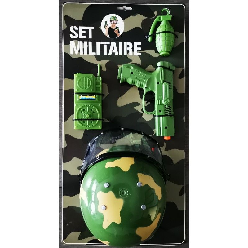 SET MILITAIRE/SOLDAT - Casque, talkie, grenade, pistolet ENFANT (en plastique)